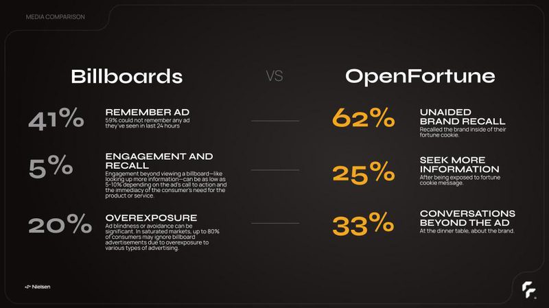 These crunchy snacks boast a jaw-dropping 62% unaided brand recall rate. That’s over three-fifths of people who can actually remember what they saw on a fortune cookie, compared the 41% for billboard ads.