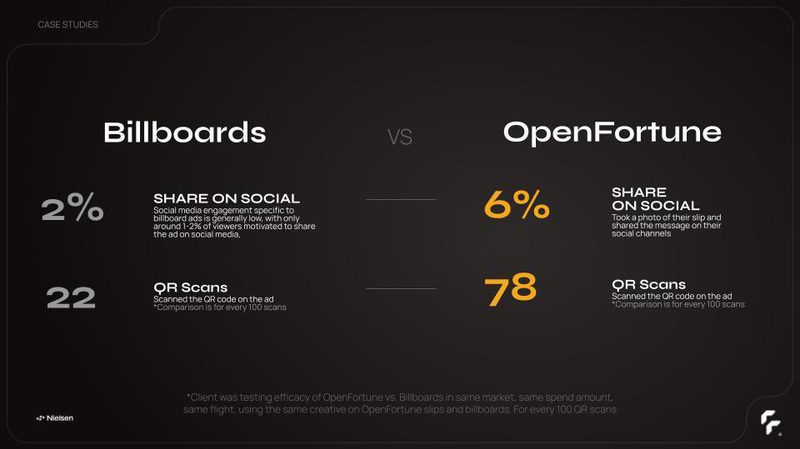 Much like billboards, doling out millions of cookies creates a perception of scale. But unlike billboards, which you might glance at briefly, fortune cookies create the 1:1 emotional connection with your audience that we mentioned above. In fact, when pitted head-to-head against billboards in the same market with identical messaging, OpenFortune's cookies scored 78 QR scans compared to the billboards' 22