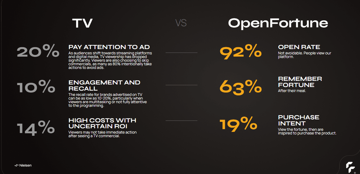 When viewers see TV commercials, they've already mastered the art of mentally checking out. But crack open a fortune cookie, and something entirely different happens. Fortunes are strategically written for a perfectly integrated bite-sized moment. Immediately, you're stitching that message to your life, that brand to your memory. No fighting for attention. No forced engagement. It just lands.
